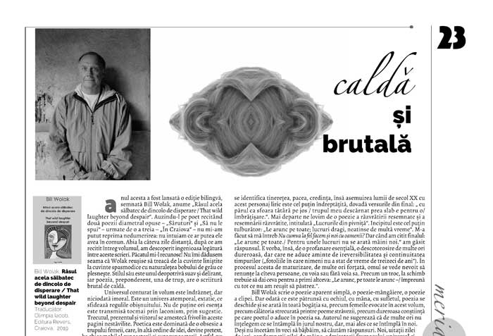 Anul acesta a fost lansată o ediție bilingvă, semnată Bill Wolak, anume „Râsul acela sălbatec de dincolo de disperare / That wild laughter beyond despair“. Auzindu-l pe poet recitând două poezii diametral opuse – „Săruturi“ și „Să nu le spui“ – urmate de o a treia – „În Craiova“ – nu mi-am putut reprima nedumerirea: nu intuiam ce ar putea ele avea în comun. Abia la câteva zile distanță, după ce am recitit întreg volumul, am descoperit ingenioasa legătură între aceste scrieri. Păcatul mi-l recunosc! Nu îmi dădusem seama că Wolak reușise să treacă de la cuvinte liniștite la cuvinte spasmodice cu naturalețea bobului de grâu ce plesnește. Stilul său este unul deopotrivă suav și delirant, iar poezia, preponderent, una de trup, are o scriitură brutal de caldă.