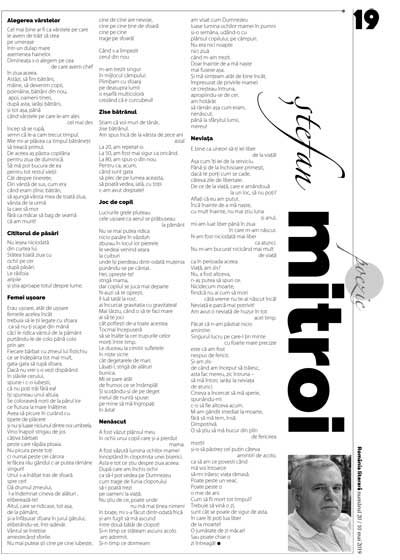 secțiune scrie: frică scrie: iubire mi-am furat singură căciula când m-am născut în loc să stau frumos în bătaia neființei acumulând eoni până la o altă ivire făcusem din ocoliș un blazon mai multe sumedenie (și tot mai aveam de ocolit) într-o confrerie a refuzurilor extinsă în care nici curba lui Gauss nu ne mai …